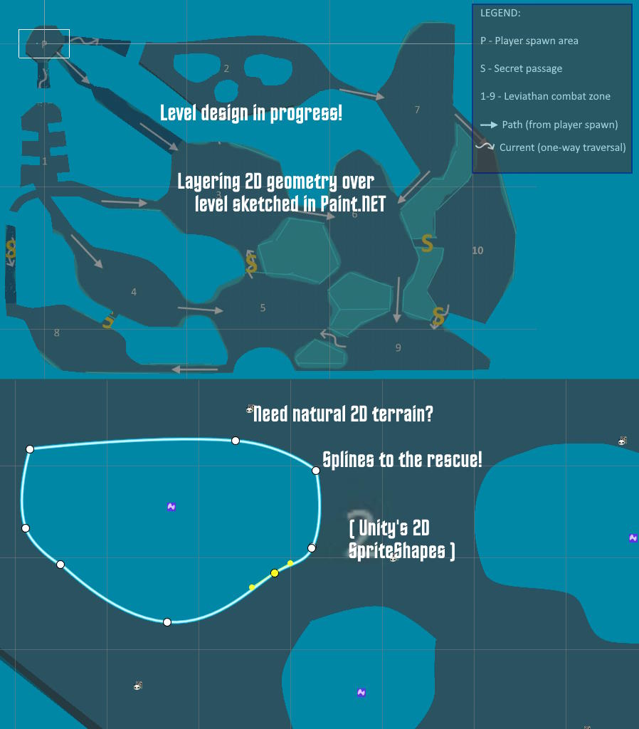 After mocking up a level in Paint.NET, I used Unity’s 2D SpriteShape tool to create the geometry for the level in the editor. Getting nav meshes to work properly for a 2D game required jumping through some hoops, even with the aid of the custom NavMeshPlus package. I would be more specific, but the series of steps I had to take was not at all intuitive, so I don’t remember exactly what they were. Point is, it works now, which is the important thing.