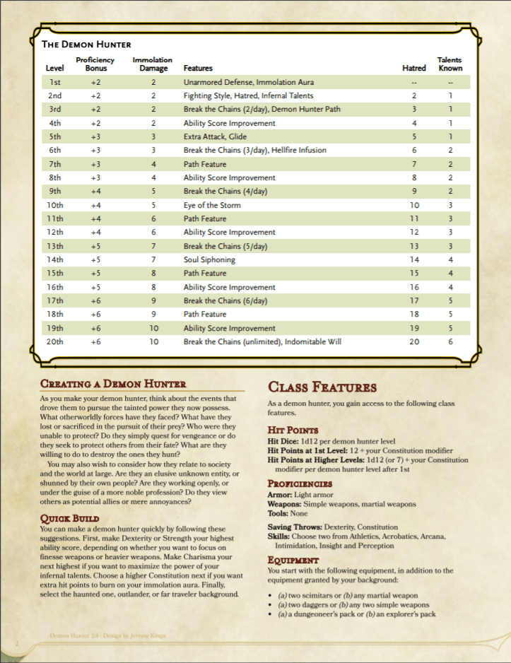 My initial goal for this project was to present the Demon Hunter from Blizzard Entertainment’s Warcraft universe as a playable class in D&D. To do this, I took features from several existing classes, such as the Barbarian, Monk, and Warlock, and retooled them to create something new that fits the Warcraft-ian Demon Hunter fantasy.